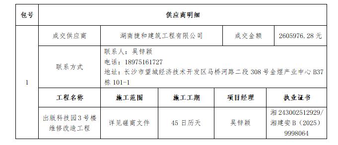 湖南出版投資控股集團有限公司的出版科技園3號樓維修改造工程競爭性磋商采購項目于2026年03月23日結束,現將成交結果公告如下: