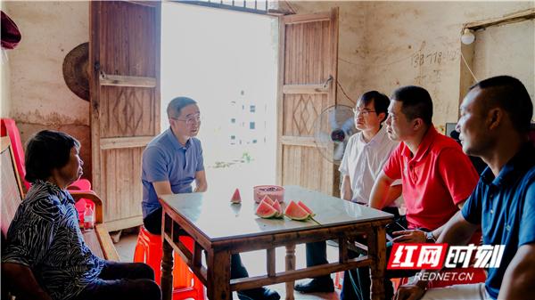 湖南出版投資控股集團黨委書記、董事長、中南出版傳媒集團股份有限公司董事長彭玻(左二)走進結對幫扶對象家中,仔細詢問脫貧致富中的實際困難。